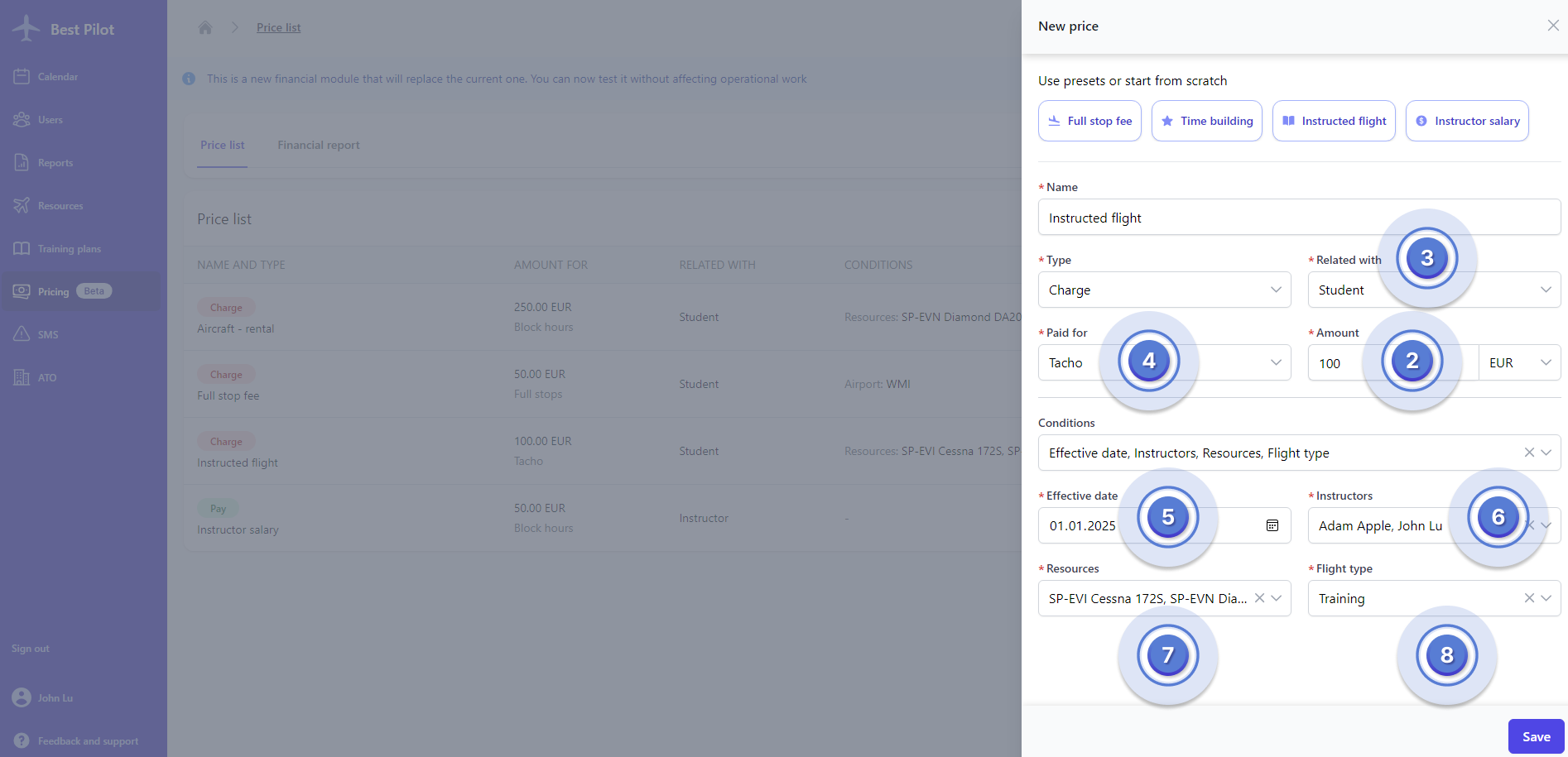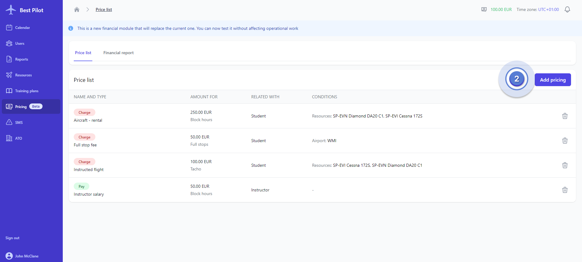 The charge of 100 EUR (2) will be applied to the user selected as a Student (3) for every Tacho hour flown (4) (counted proportionally)