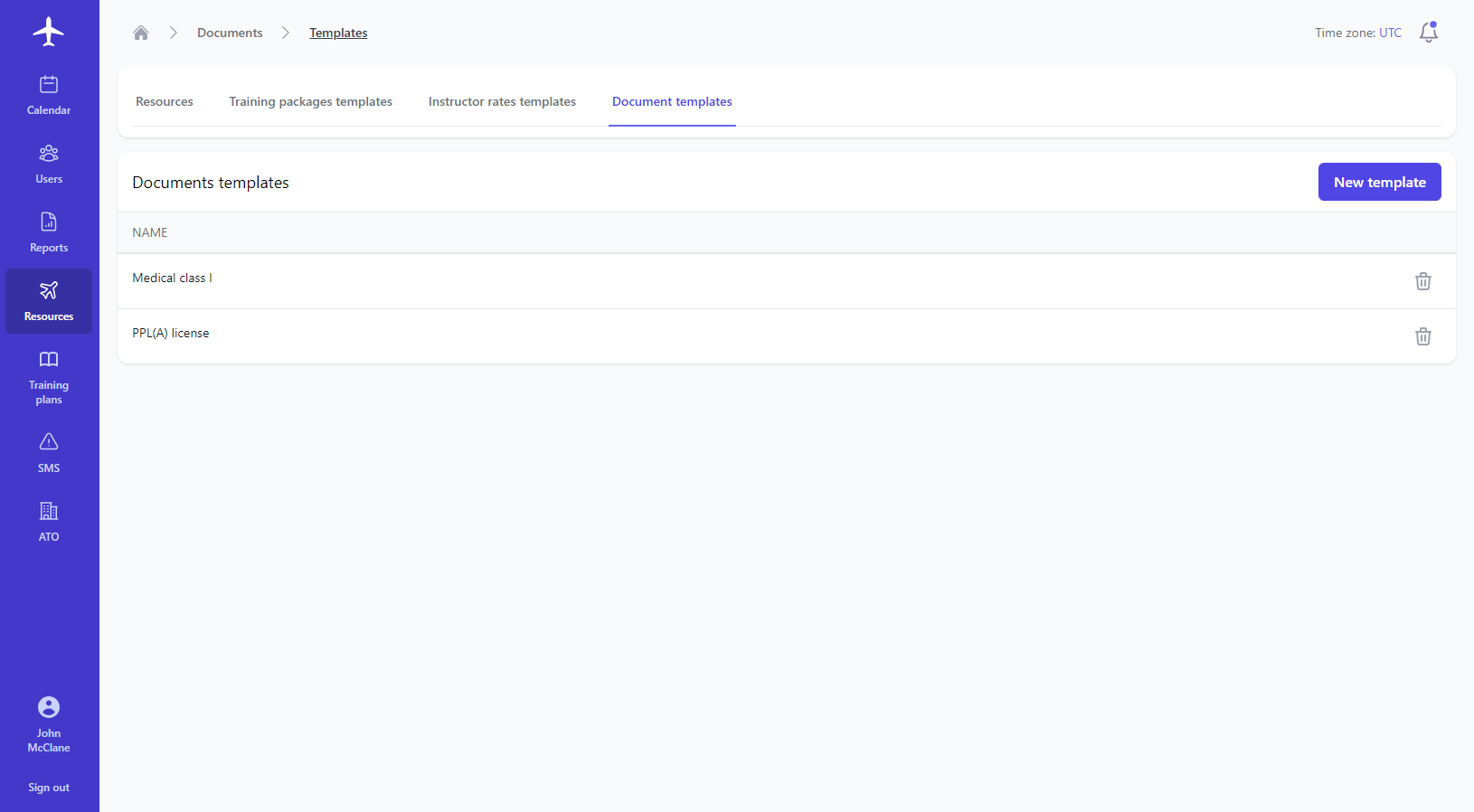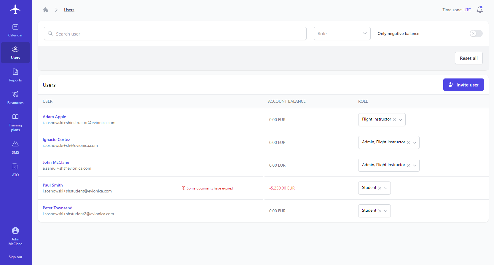 - Resources - possibility of choosing one or more resources, for example: aircraft, simulators.